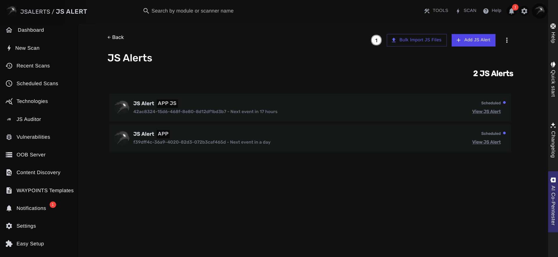 You can specify a list of target URLs for JSAUDITOR to check for common vulnerabilities found in JavaScript files. Optionally, you may configure any settings you’d like. Afterward, simply click on Scan to launch your scan. Shortly after your scan has been launched, you will be redirected to the page to view your monitoring dashboard.