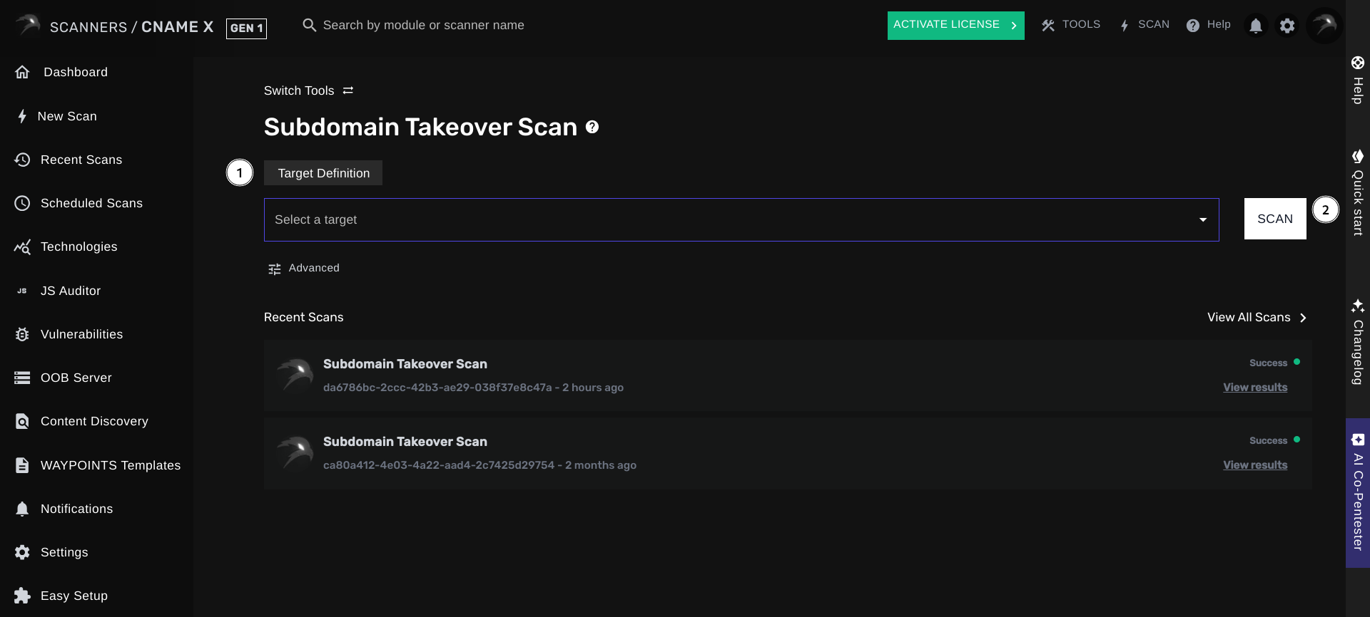 You can specify a list of target domains for CNAME X to check for subdomain takeover vulnerabilities. Optionally, you may configure any settings you’d like. Afterward, simply click on Scan to launch your scan. Shortly after your scan has been launched, you will be redirected to the page to view your pending scan.